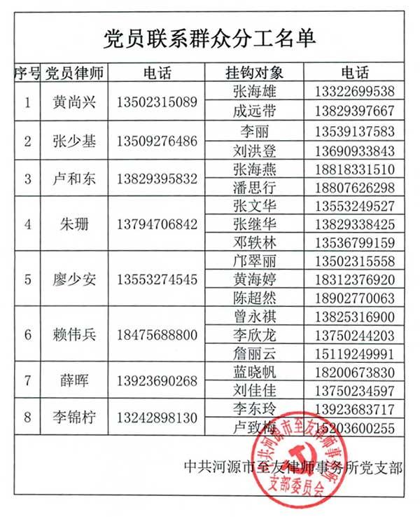 根據(jù)中共河源市律師行業(yè)委員會(huì)《關(guān)于全市律師行業(yè)開(kāi)展"不忘初心、牢記使命"主題教育的實(shí)施方案》 (河律黨[2019])11號(hào))和相關(guān)文件要求,為在事務(wù)所有效開(kāi)展"不忘初心、牢記使命"主題教育,充分發(fā)揮黨支部在事務(wù)所發(fā)展中的戰(zhàn)斗堡壘作用和黨員先鋒模范作用,密切事務(wù)所黨群關(guān)系,中共河源市至友律師事務(wù)所黨支部決定在全所實(shí)施"不忘初心、牢記使命"主題教育黨員聯(lián)系群眾分工,根據(jù)事務(wù)所現(xiàn)狀安排如下: