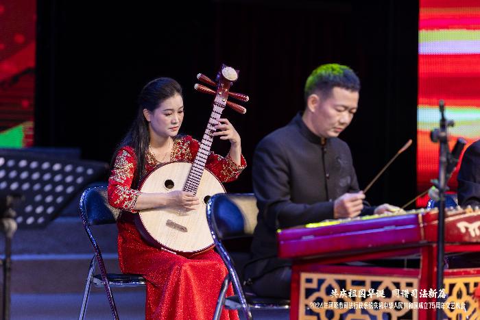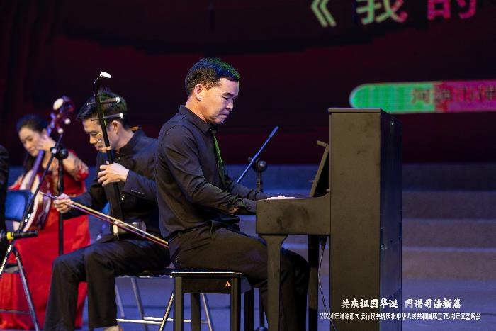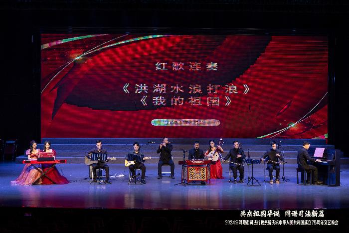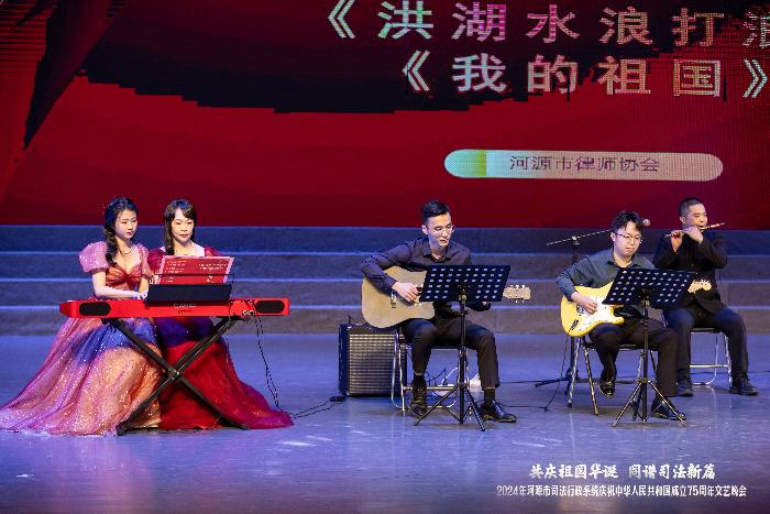 晚會(huì)現(xiàn)場(chǎng)一首首激昂的歌曲,唱響了司法行政人和法律服務(wù)工作者對(duì)祖國(guó)的忠誠(chéng)與擔(dān)當(dāng);一段段優(yōu)美的舞蹈,展現(xiàn)了司法行政人和法律服務(wù)工作者積極向上的精神風(fēng)貌;一個(gè)個(gè)生動(dòng)的小品,反映了司法行政工作中的點(diǎn)滴故事和為民情懷;一篇篇深情的朗誦,訴說(shuō)著司法行政人和法律服務(wù)工作者對(duì)祖國(guó)母親的眷戀與感恩。其中,我所至友樂(lè)隊(duì)(張繼華、賴(lài)偉兵、朱惠芳、李東玲、盧振翔等律師協(xié)同五位專(zhuān)業(yè)器樂(lè)演奏老師)在本次文藝晚會(huì)以器樂(lè)連奏形式出演第一個(gè)節(jié)目《洪湖水浪打浪》、《我的祖國(guó)》,以其悠揚(yáng)且耳熟能詳?shù)男?,仿佛將我們帶回到了那片美麗的水鄉(xiāng)。而當(dāng)它與《我的祖國(guó)》一同響起,那對(duì)祖國(guó)的熱愛(ài)與祝福便如滔滔江水,洶涌澎湃。